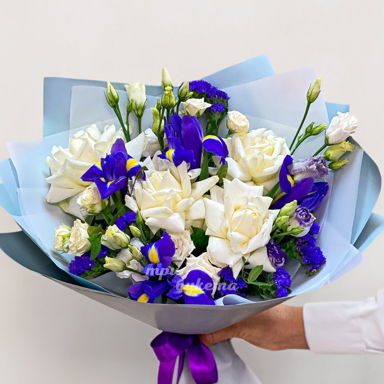 Букет белых французских роз с ирисами