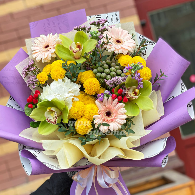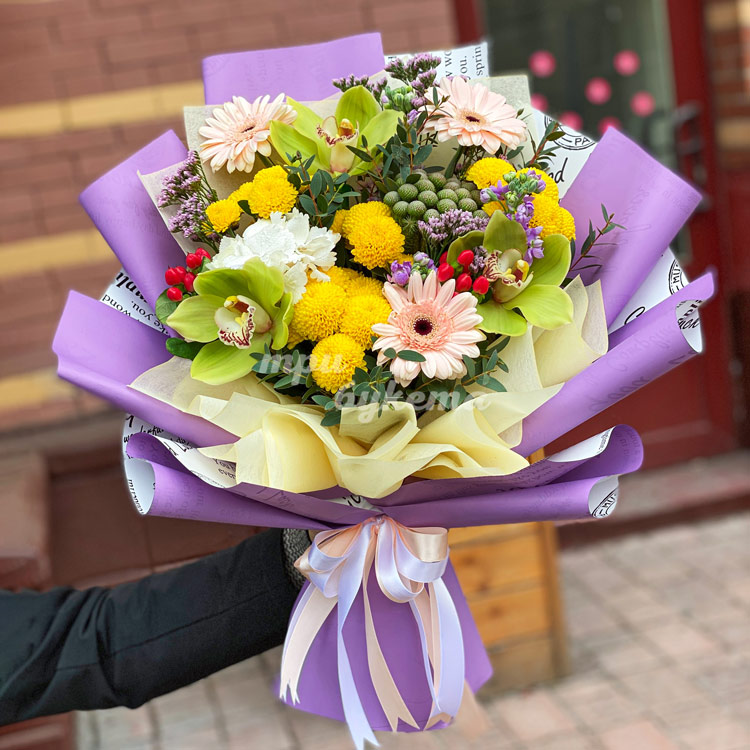 Букет из хризантем, гербер и орхидей
