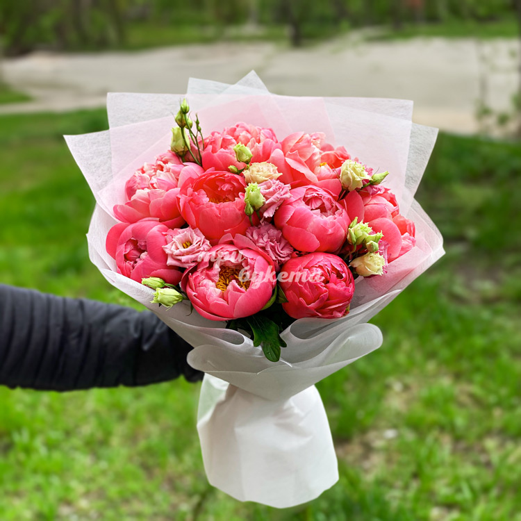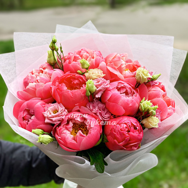 Букет коралловых пионов и розовых эустом