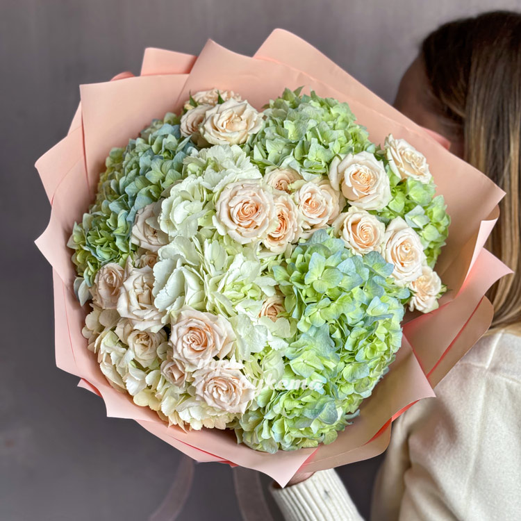 Букет кремовых роз и зеленых гортензий