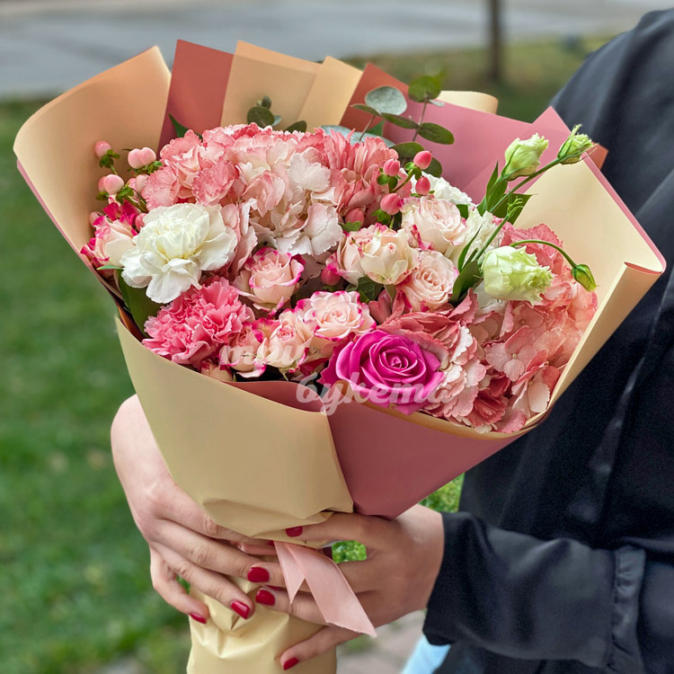 Букет персиковых гортензий и роз