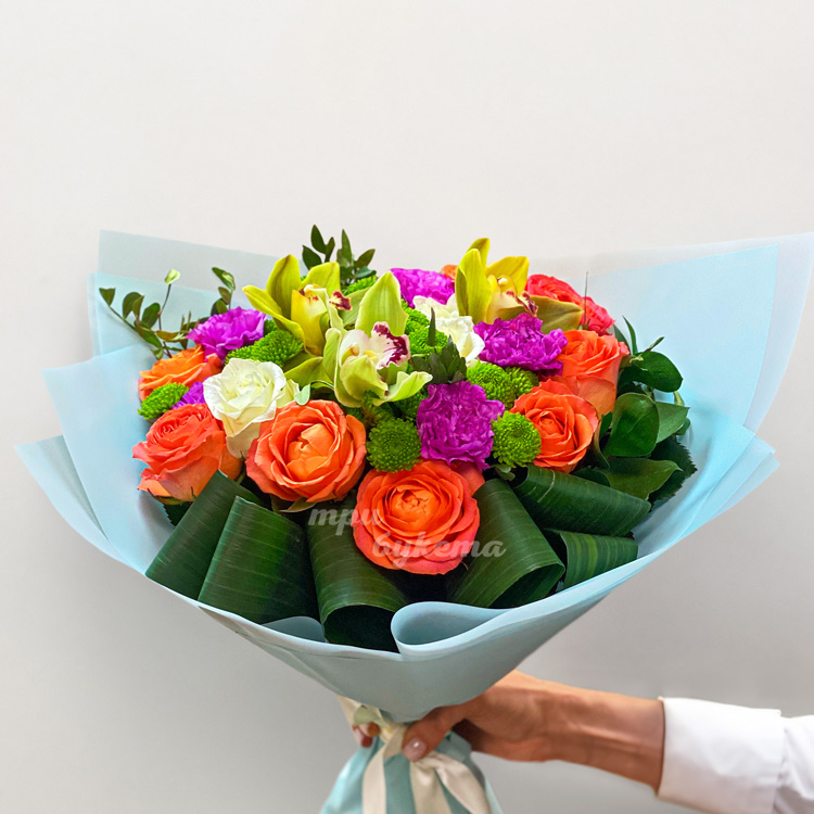 Букет ярких орхидей, гвоздик и роз