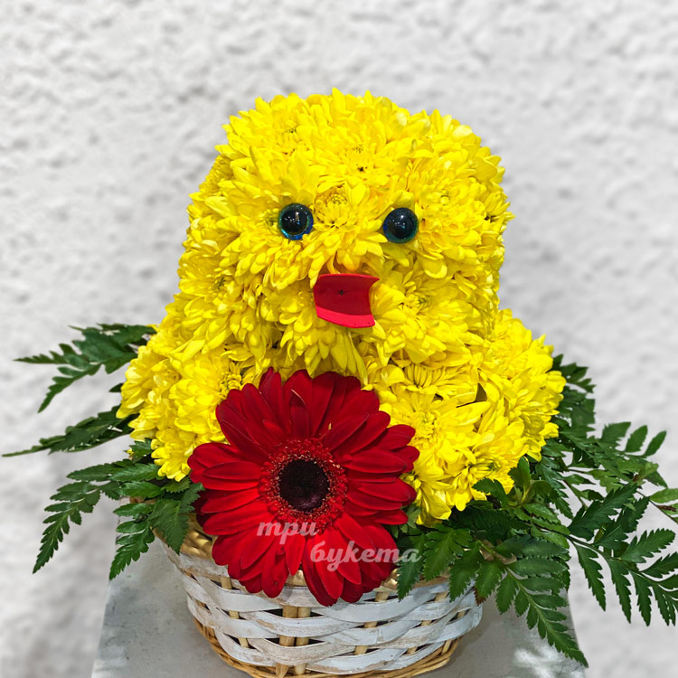Цыпленок из хризантем в корзине