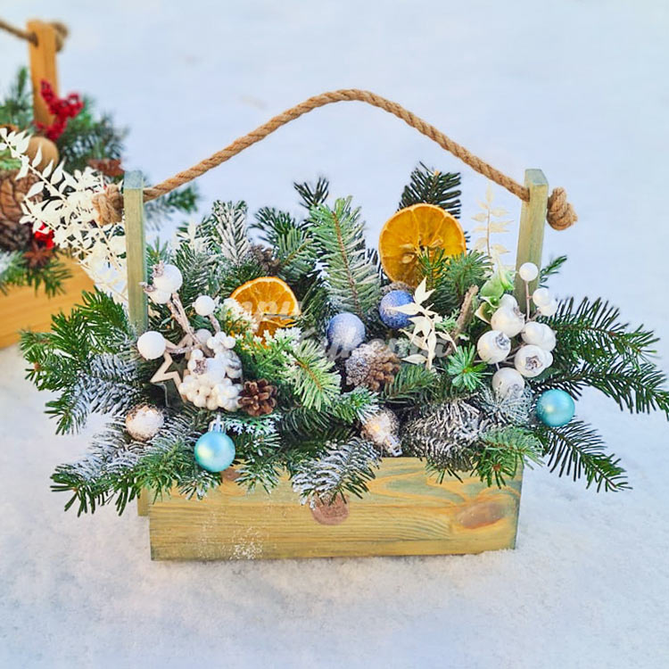 Елочные украшения и ветки в ящике
