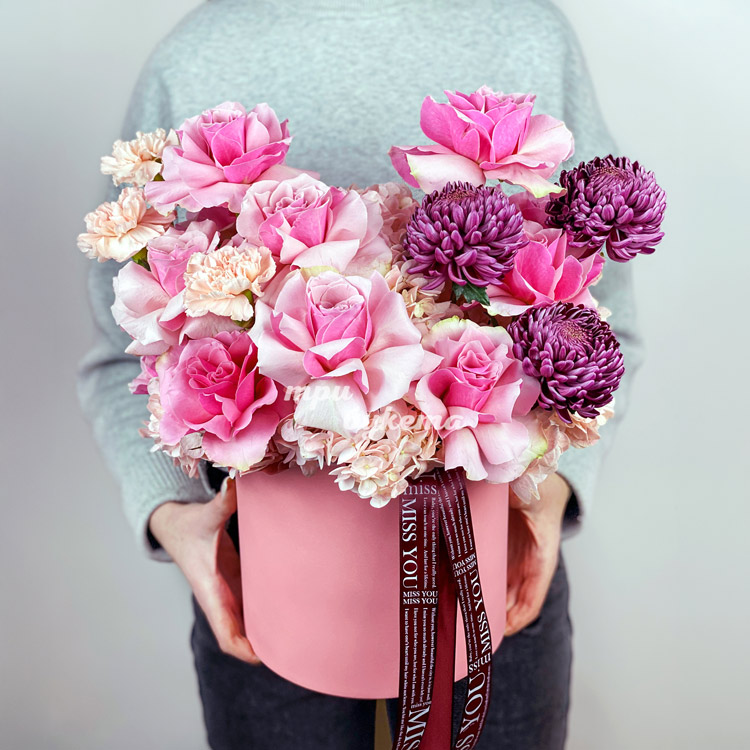 Коробка розовых французских роз и хризантем