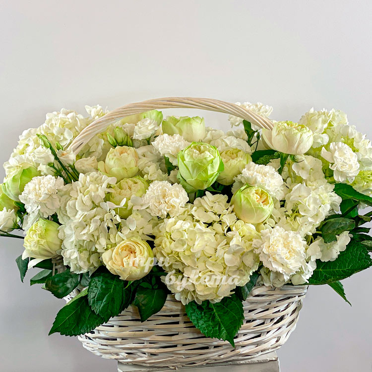 Корзина белых гортензий, гвоздик и роз