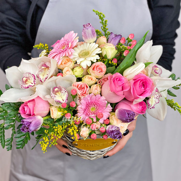 Корзина орхидей с тюльпанами