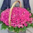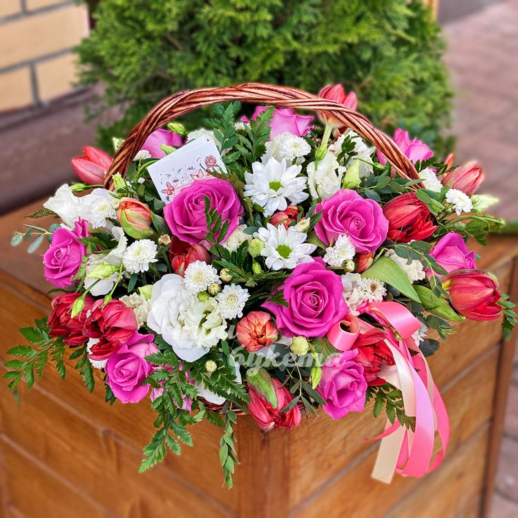 Корзина розовых роз и красных тюльпанов