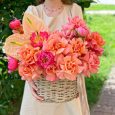 Корзина ярких пионов, роз и гортензий