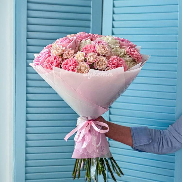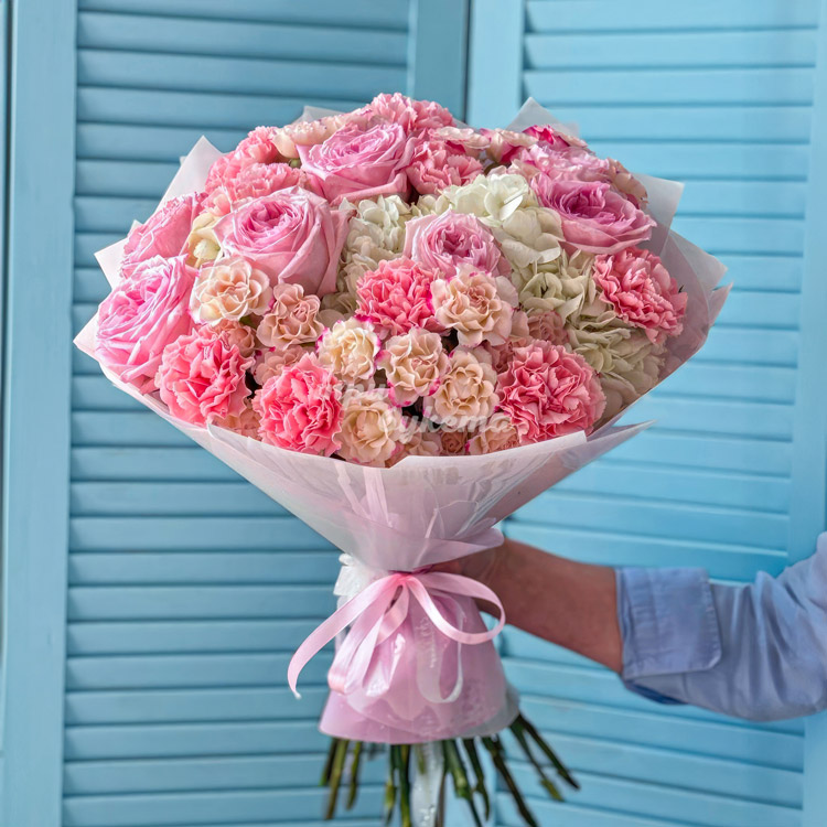 Розовый букет роз, диантусов и гортензий